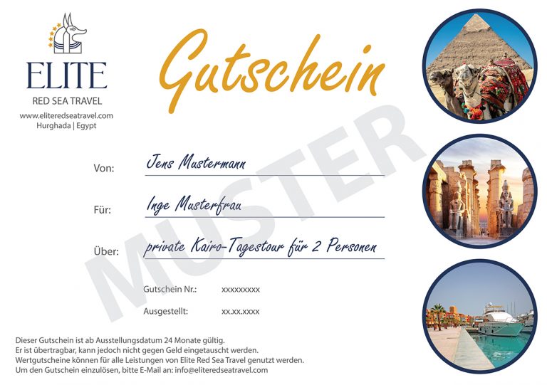 Senden Sie uns eine Anfrage mit dem gewünschten Erlebnis (z.B. Tagestour nach Kairo, Spa-Paket oder VIP-Flughafentransfer). Wir erstellen Ihnen ein Angebot und schicken es Ihnen zusammen mit unserer Bankverbindung zu. Nach Erhalt der Überweisung senden wir Ihnen den personalisierten Gutschein als pdf per E-Mail.